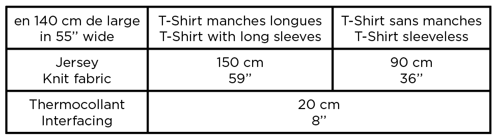 Pour confectionner ce modèle, il faut absolument utiliser un jersey. Poids : 150-300 gr/m2, 4,5-8 oz/y2