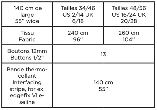 Pour ce modèle, préférez les matières légères et fluides comme le crêpe viscose, le satin de soie ou un coton léger. Poids : environ 150-250 gr/m2.