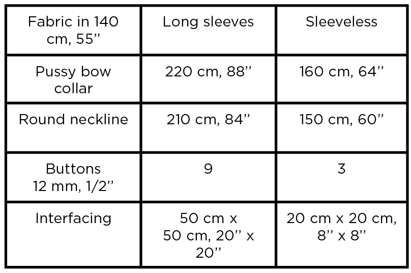 For this model, prefer light and flowing fabrics such as viscose crepe, silk satin or light cotton. Weight: approximately 150/250 gr, 4,42 /7,37 oz/yd2